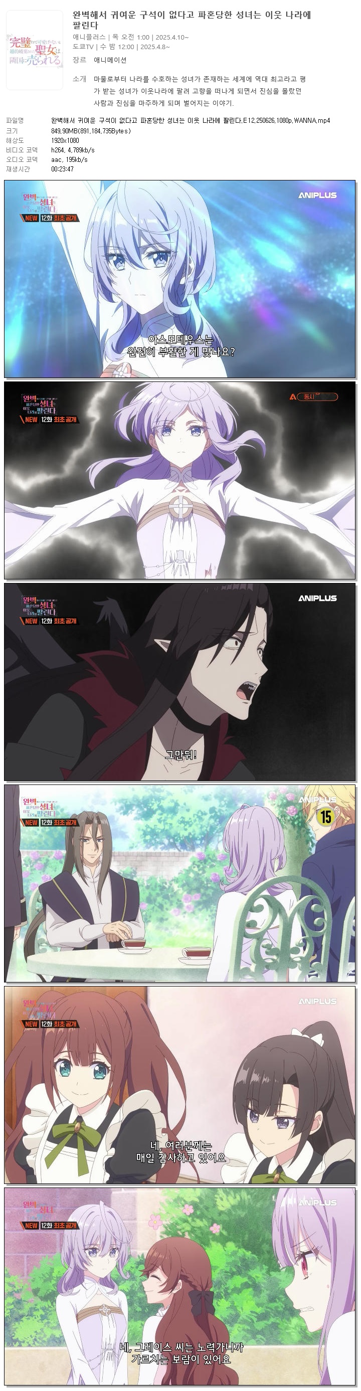 완벽해서 귀여운 구석이 없다고 파혼당한 성녀는 이웃 나라에 팔린다.E12.250626.1080p.WANNA 다시보기 토렌트