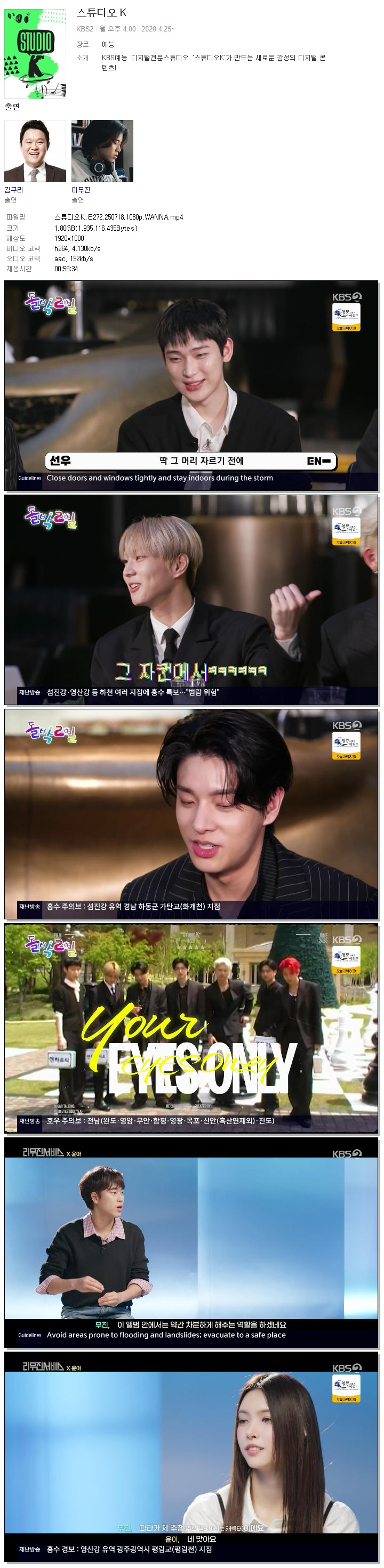 | [KBS2] 스튜디오K.E272.250718.1080p.WANNA.mp4 | 1.8 G | 00:59:34 | 1920x1080 |