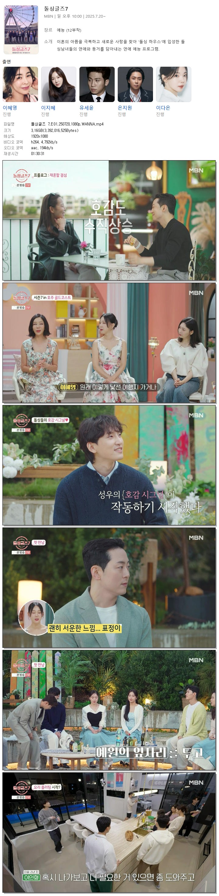 [MBN] 돌싱글즈 7.E01.250720.1080p.WANNA[이혜영, 이지혜].mp4 3.2 G 01:30:31 1920x1080