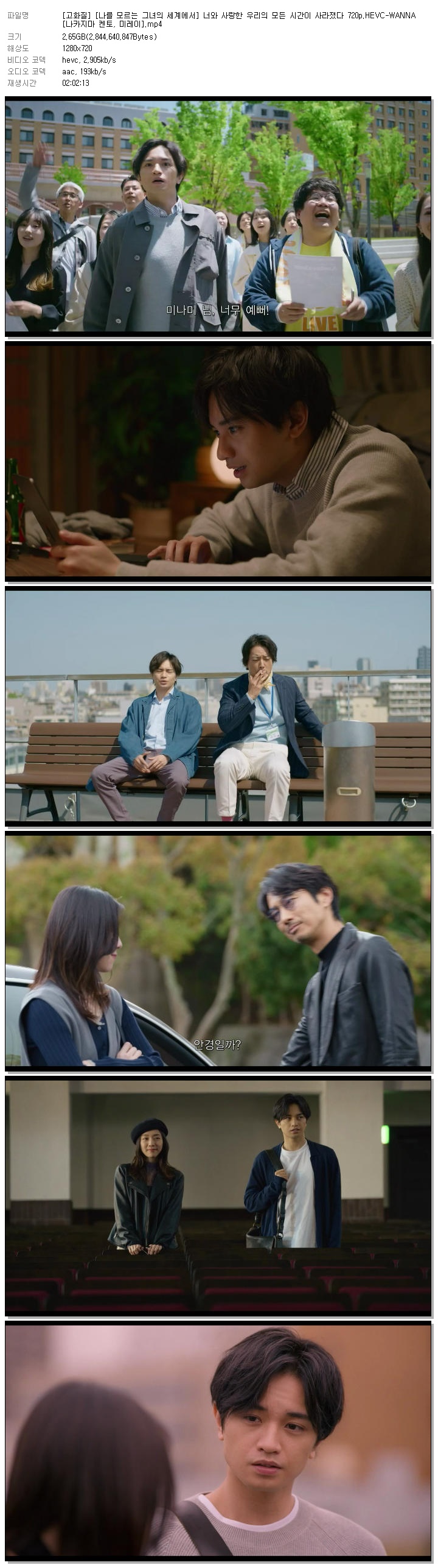 | [고화질] [나를 모르는 그녀의 세계에서] 너와 사랑한 우리의 모든 시간이 사라졌다 720p.HEVC-WANNA[나카지마 켄토, 미레이].mp4 | 2.6 G | 02:02:13 | 1280x720 |