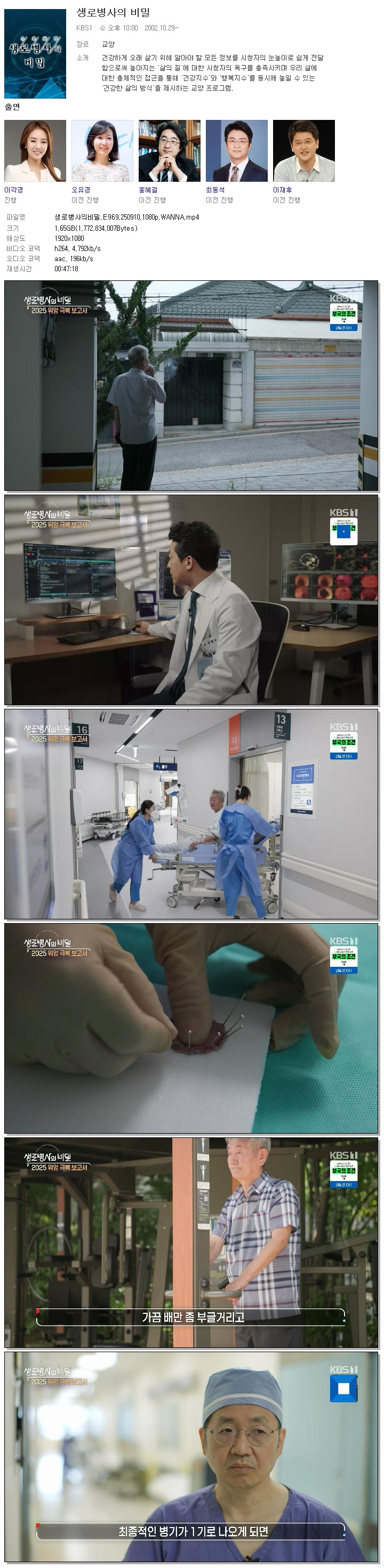 | [KBS1] 생로병사의비밀.E969.250910.1080p.WANNA.mp4 | 1.7 G | 00:47:18 | 1920x1080 |