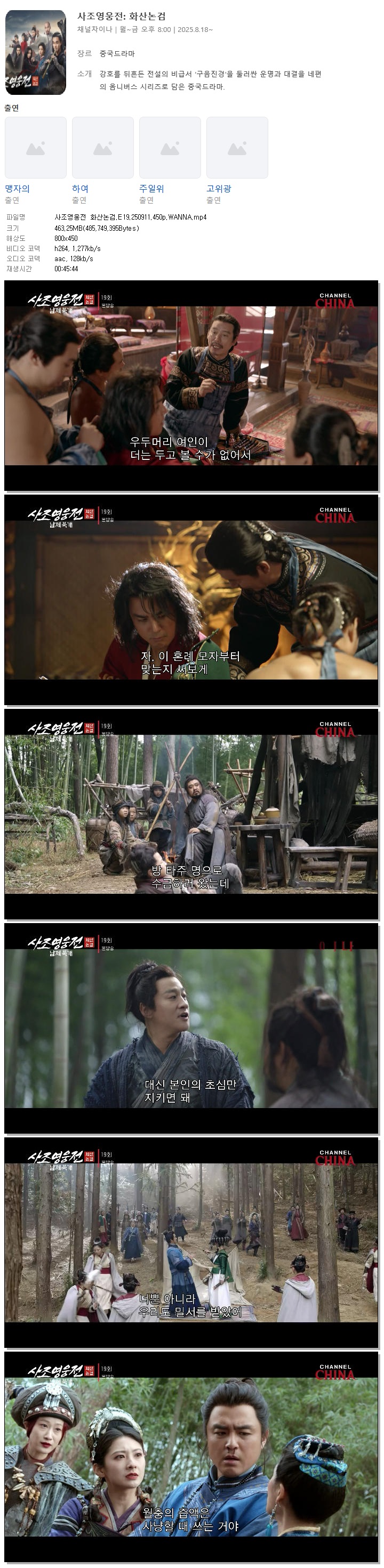 | [채널차이나] 사조영웅전 화산논검.E19.250911.450p.WANNA[맹자의, 하여].mp4 | 463.2 M | 00:45:44 | 800x450 |