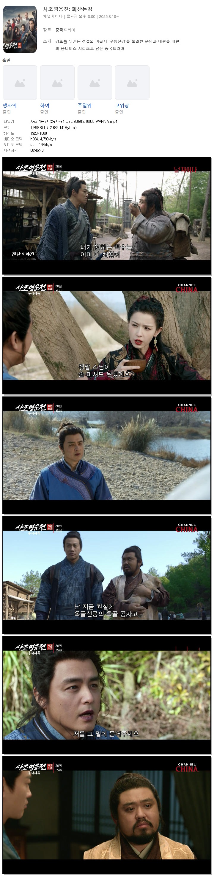 | [채널차이나] 사조영웅전 화산논검.E20.250912.1080p.WANNA[맹자의, 하여].mp4 | 1.6 G | 00:45:43 | 1920x1080 |