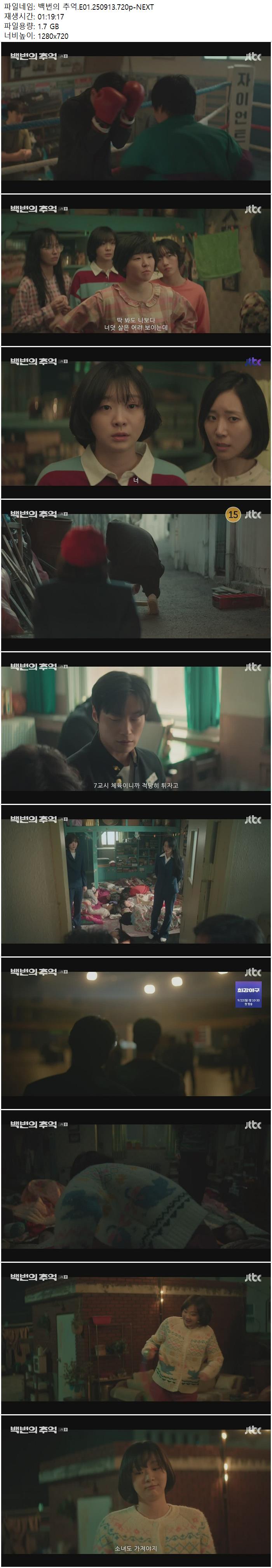 | 백번의 추억.E01.250913.720p-NEXT.mp4 | 1.7 G | 01:19:17 | 1280x720 |