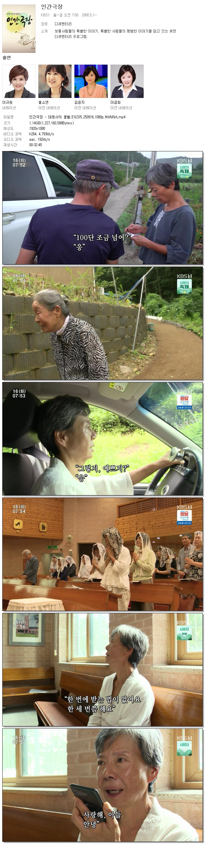 | [KBS1] 인간극장.E6205.250916.1080p.WANNA.mp4 | 1.1 G | 00:32:45 | 1920x1080 |