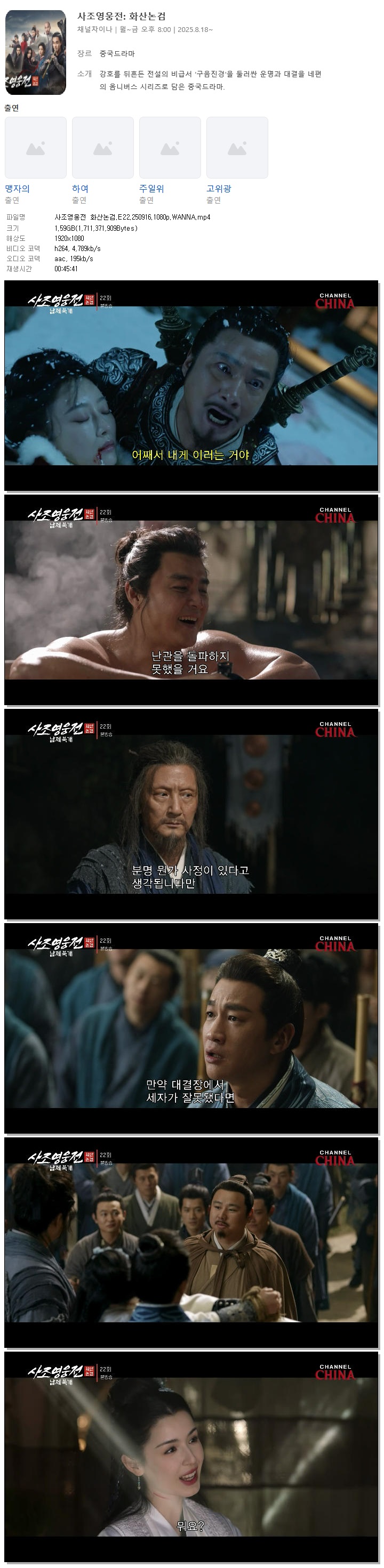 | [채널차이나] 사조영웅전 화산논검.E22.250916.1080p.WANNA[맹자의, 하여].mp4 | 1.6 G | 00:45:41 | 1920x1080 |