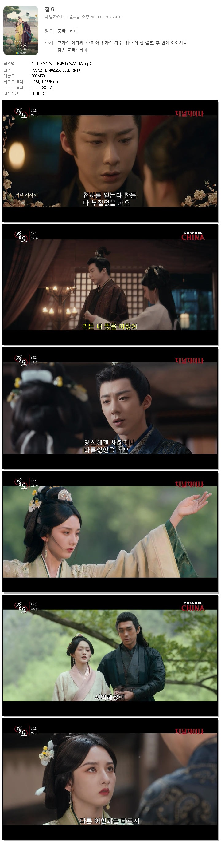 | [채널차이나] 절요.E32.250916.450p.WANNA[송조아, 류우녕].mp4 | 459.9 M | 00:45:12 | 800x450 |