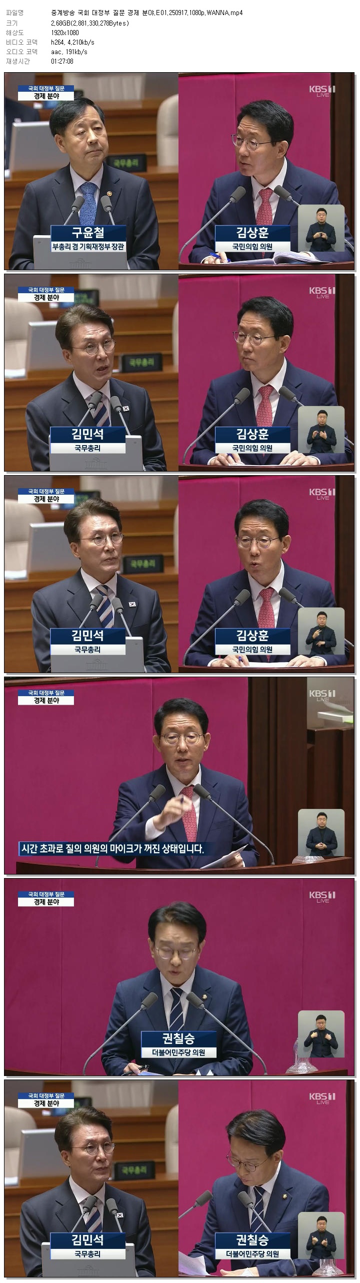 | [KBS1] 중계방송 국회 대정부 질문 경제 분야.E01.250917.1080p.WANNA.mp4 | 2.7 G | 01:27:08 | 1920x1080 |
