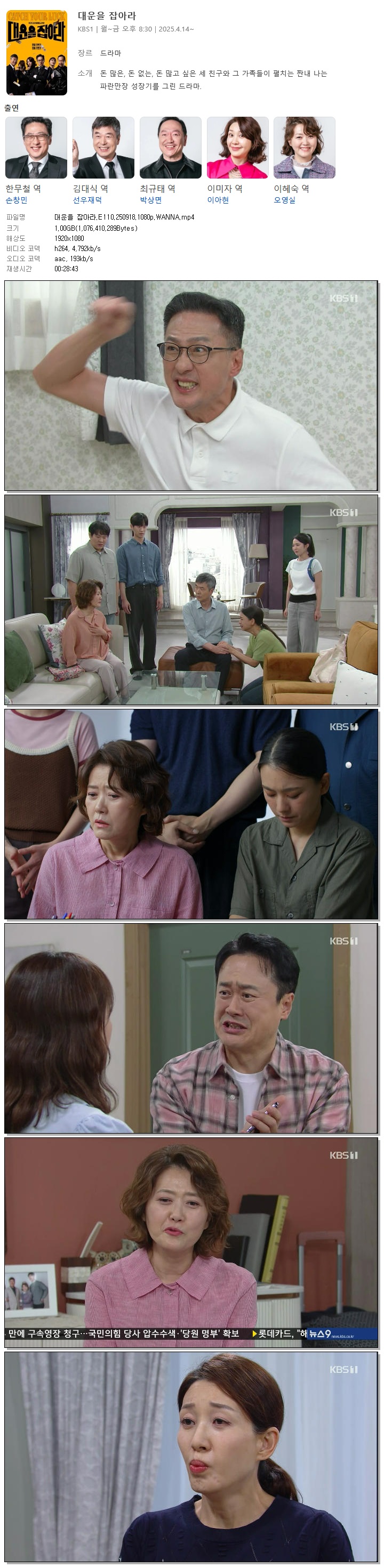 [KBS1] 대운을 잡아라.E110.250918.1080p.WANNA[손창민, 이아현].mp4 1 G 00:28:43 1920x1080