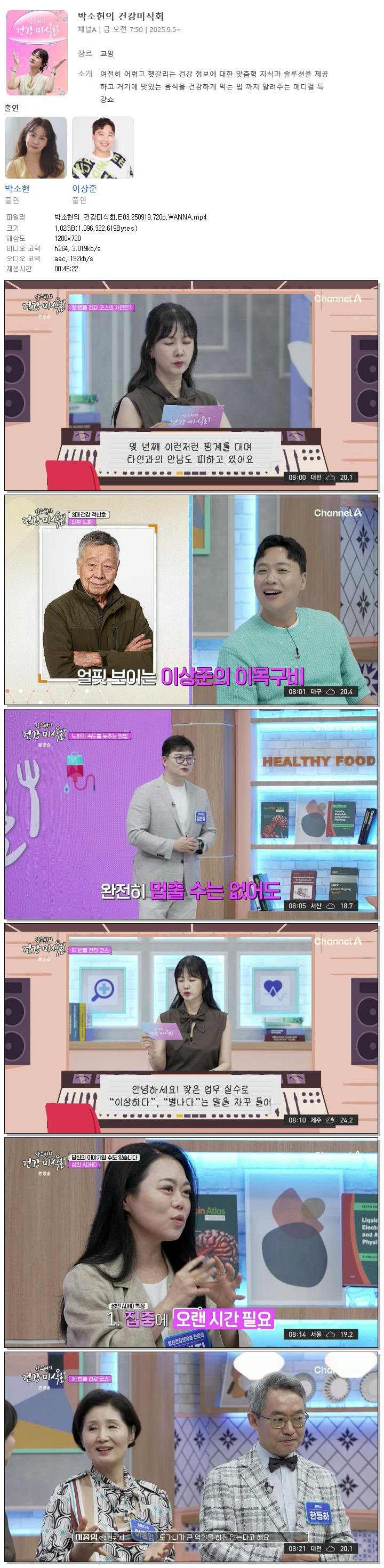 [채널A] 박소현의 건강미식회.E03.250919.720p.WANNA[박소현, 이상준].mp4 1 G 00:45:22 1280x720