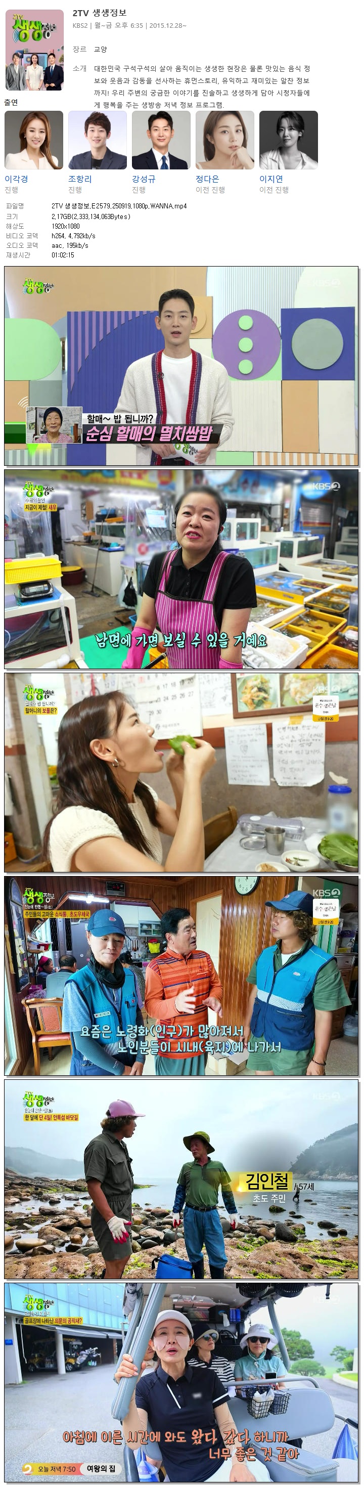 | [KBS2] 2TV 생생정보.E2579.250919.1080p.WANNA[이각경, 조항리].mp4 | 2.2 G | 01:02:15 | 1920x1080 |