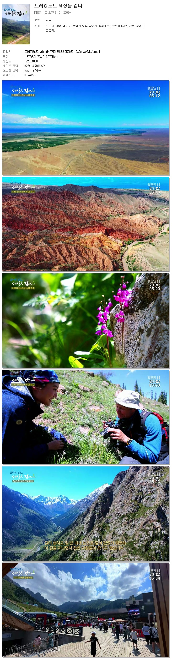 | [KBS1] 트레킹노트 세상을 걷다.E382.250920.1080p.WANNA.mp4 | 1.7 G | 00:47:58 | 1920x1080 |