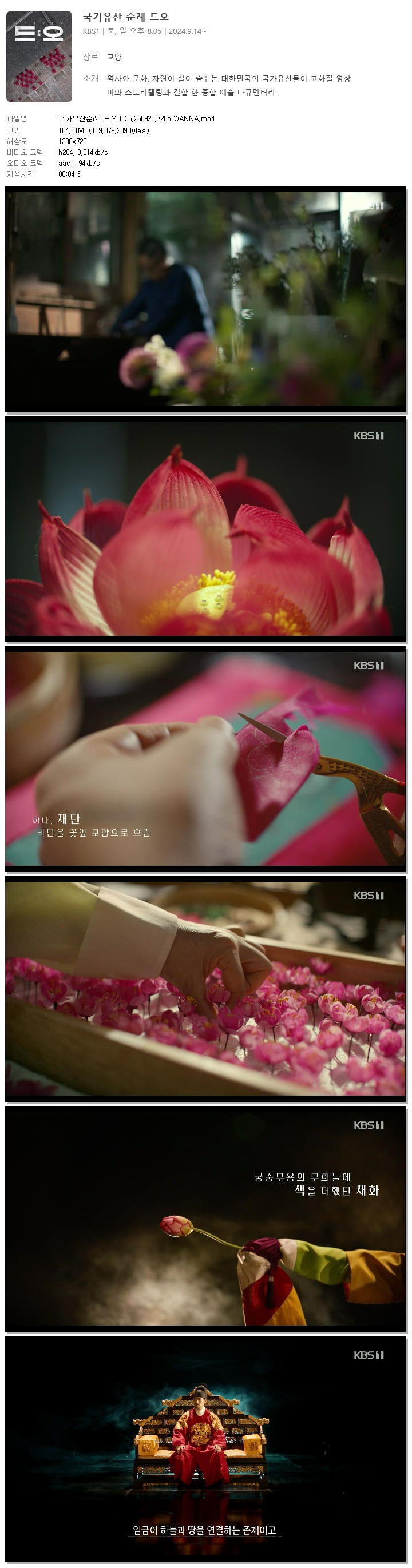 | [KBS1] 국가유산순례 드오.E35.250920.720p.WANNA.mp4 | 104.3 M | 00:04:31 | 1280x720 |
