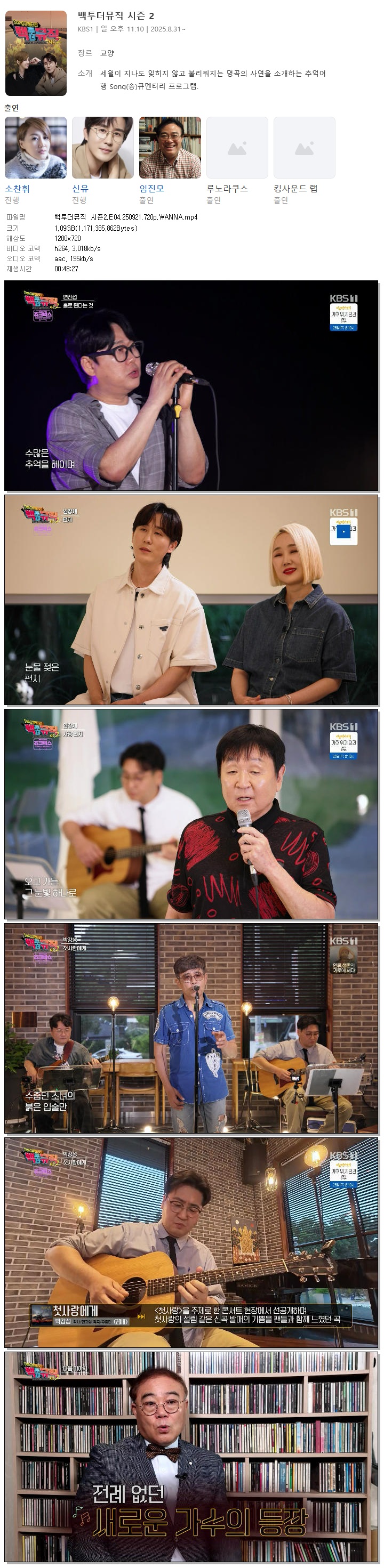 | [KBS1] 백투더뮤직 시즌2.E04.250921.720p.WANNA[변진섭, 임창제].mp4 | 1.1 G | 00:48:27 | 1280x720 |