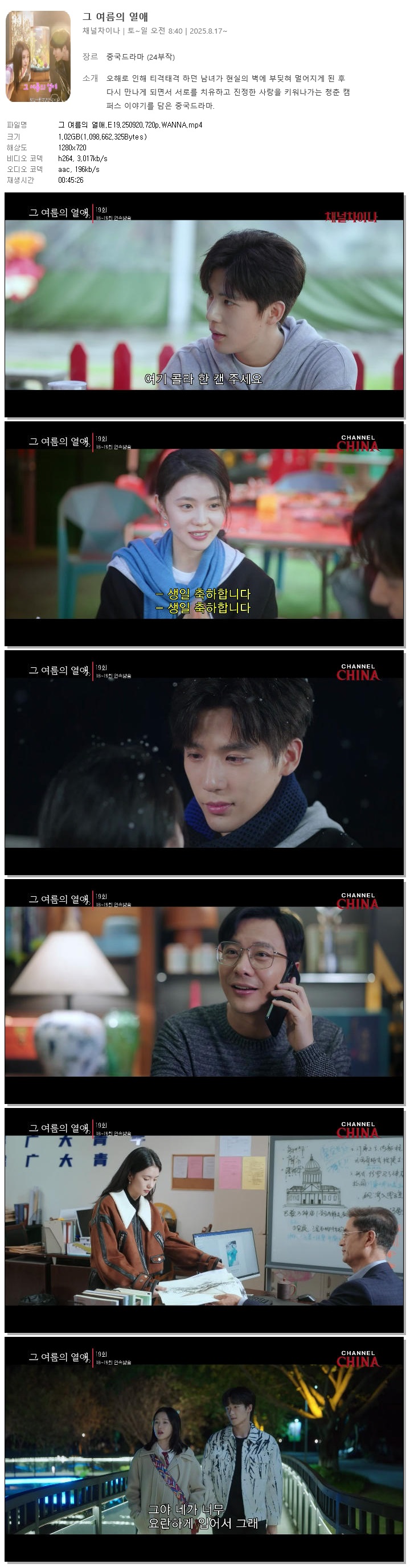 | [채널차이나] 그 여름의 열애.E19.250920.720p.WANNA[류하오춘, 왕안우].mp4 | 1 G | 00:45:26 | 1280x720 |