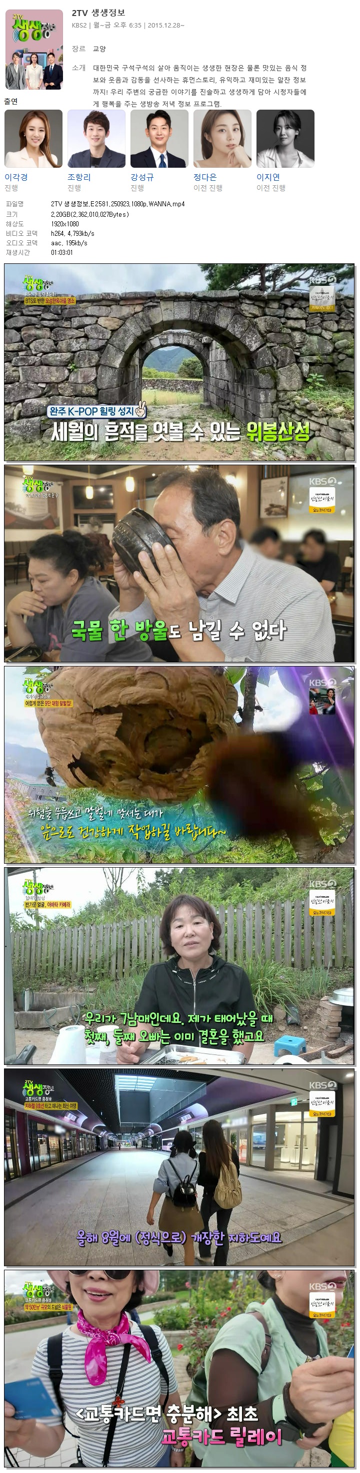 [KBS2] 2TV 생생정보.E2581.250923.1080p.WANNA[이각경, 조항리].mp4 2.2 G 01:03:01 1920x1080