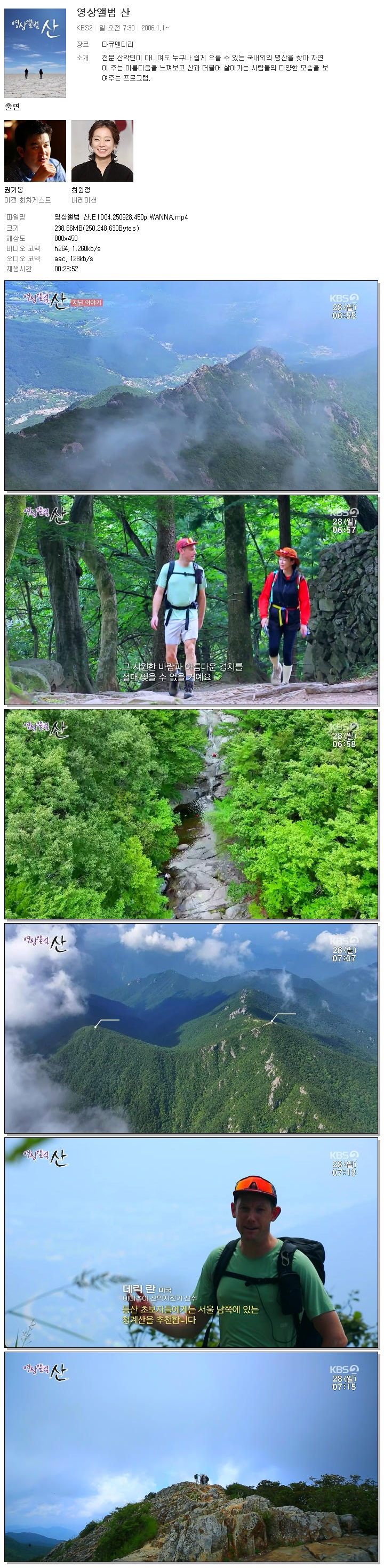 | [KBS2] 영상앨범 산.E1004.250928.450p.WANNA.mp4 | 238.7 M | 00:23:52 | 800x450 |