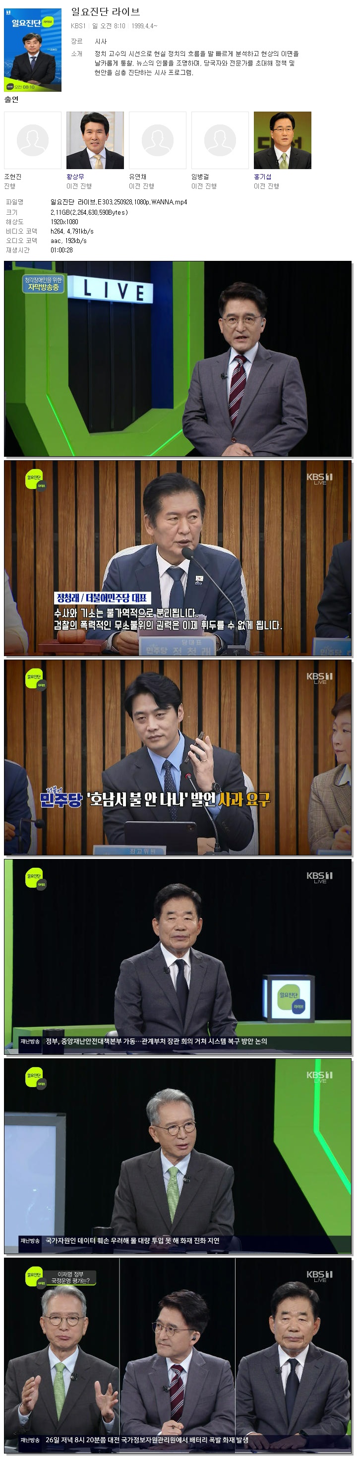 | [KBS1] 일요진단 라이브.E303.250928.1080p.WANNA[김대홍].mp4 | 2.1 G | 01:00:28 | 1920x1080 |