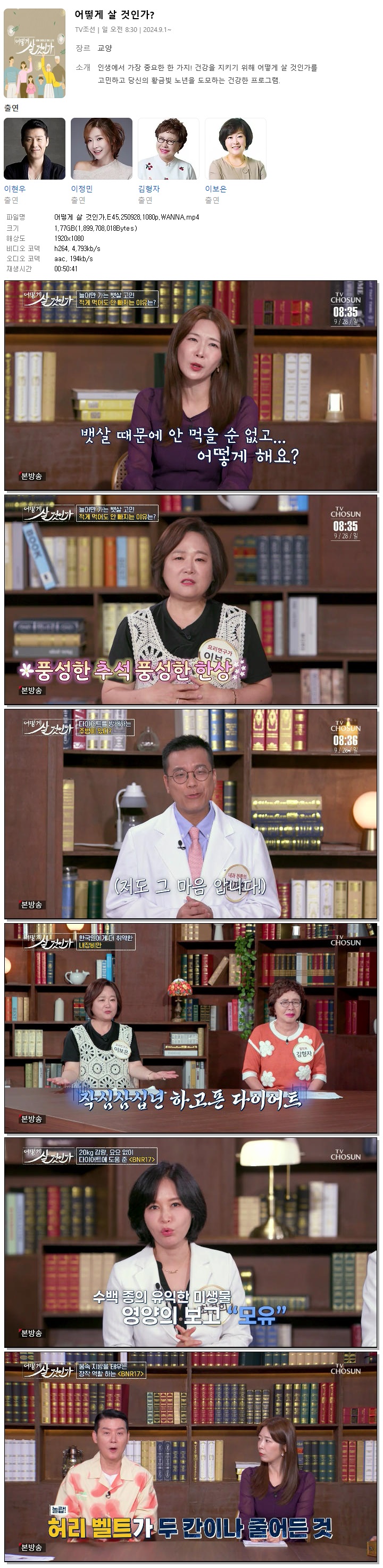 | [TV조선] 어떻게 살 것인가.E45.250928.1080p.WANNA[이현우, 이정민].mp4 | 1.8 G | 00:50:41 | 1920x1080 |