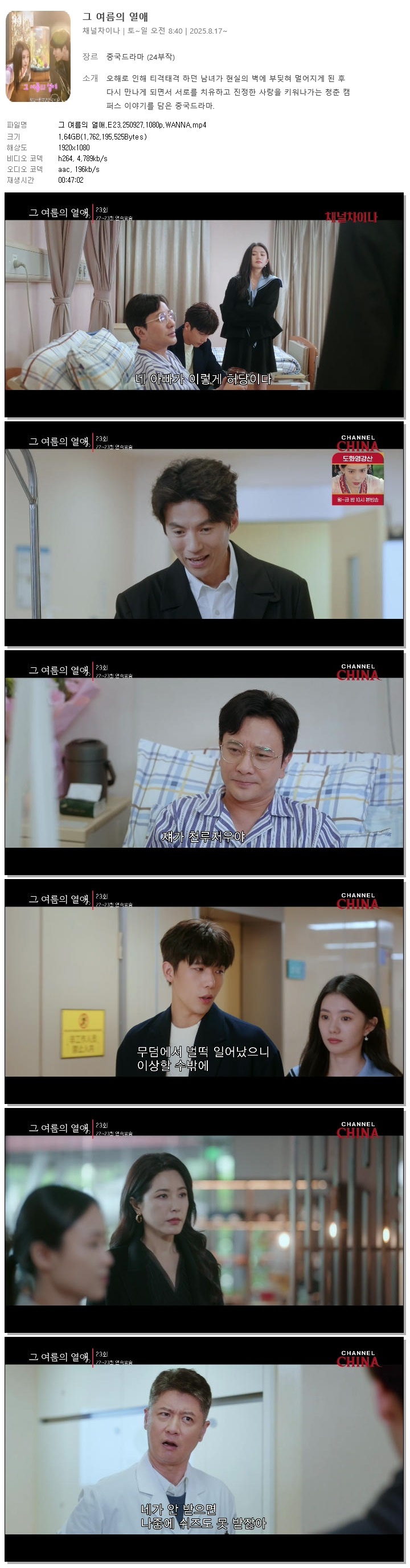 [채널차이나] 그 여름의 열애.E23.250927.1080p.WANNA[류하오춘, 왕안우].mp4 1.6 G 00:47:02 1920x1080