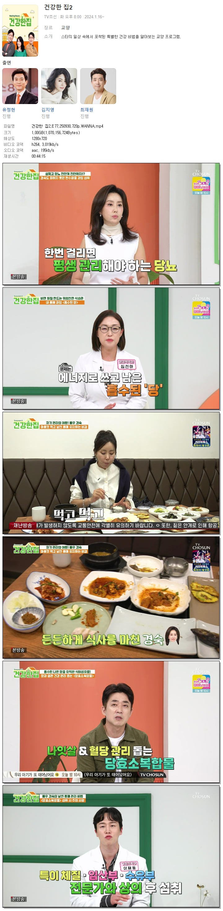 | [TV조선] 건강한 집2.E77.250930.720p.WANNA[유정현, 김지영].mp4 | 1020.6 M | 00:44:15 | 1280x720 |