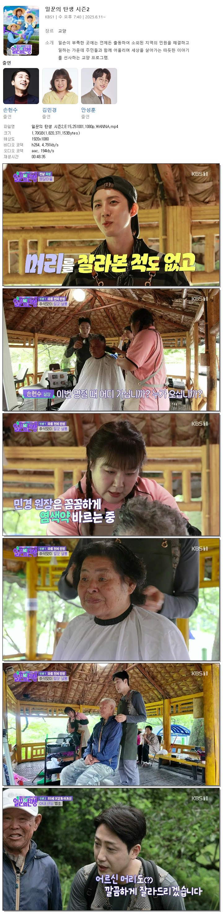 | [KBS1] 일꾼의 탄생 시즌2.E15.251001.1080p.WANNA[손헌수, 김민경].mp4 | 1.7 G | 00:48:35 | 1920x1080 |