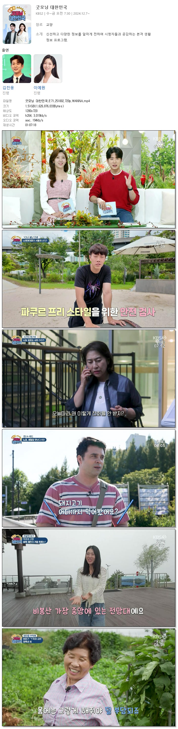 | [KBS2] 굿모닝 대한민국.E71.251002.720p.WANNA[김진웅, 이예원].mp4 | 1.5 G | 01:07:18 | 1280x720 |
