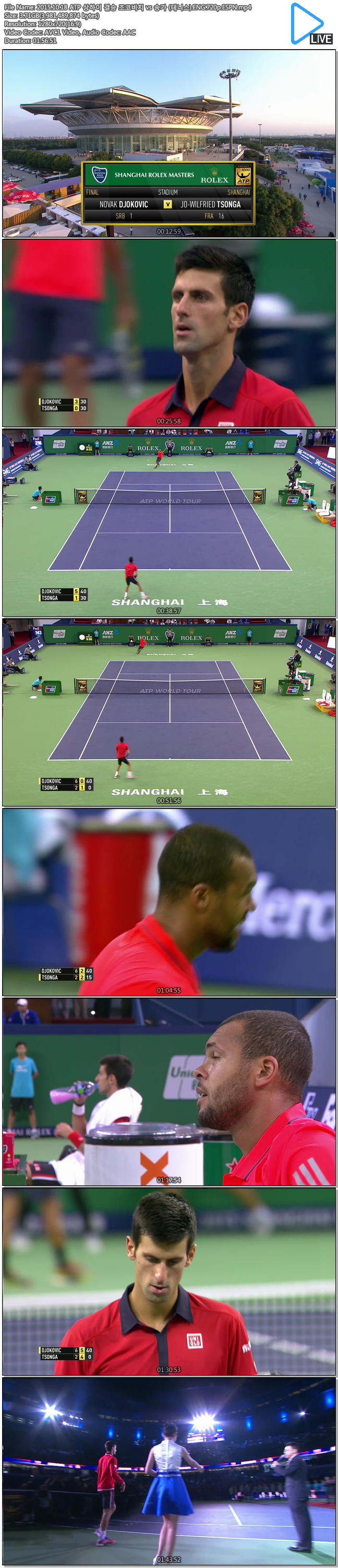| 2015.10.18 ATP 상하이 결승 조코비치 vs 송가 (테니스).ENG.720p.ESPN.mp4 | 3.7 G | 01:56:51 | 1280x720 |