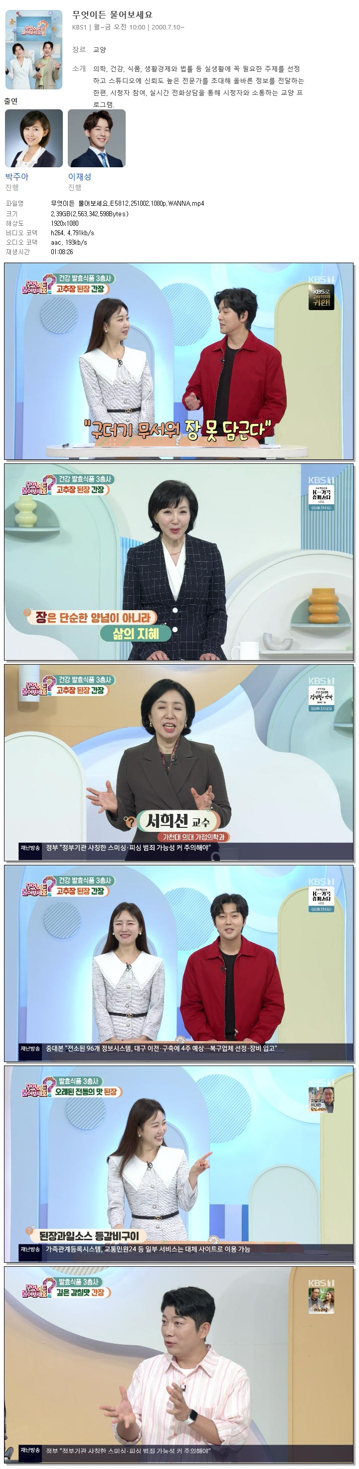| [KBS1] 무엇이든 물어보세요.E5812.251002.1080p.WANNA[박주아, 이재성].mp4 | 2.4 G | 01:08:26 | 1920x1080 |