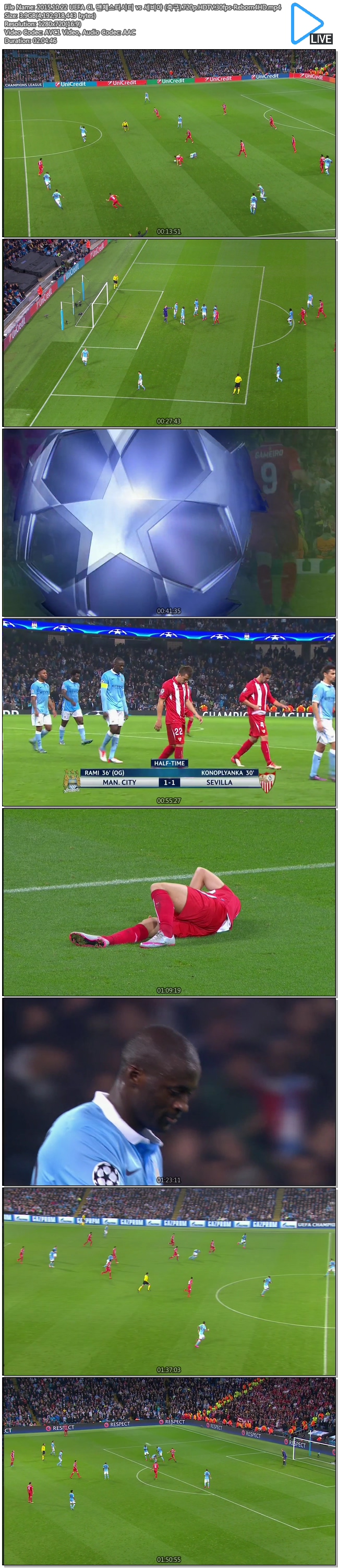 | 2015.10.22 UEFA CL 맨체스터시티 vs 세비야 (축구).720p.HDTV.30fps-Reborn4HD.mp4 | 3.9 G | 02:04:46 | 1280x720 |