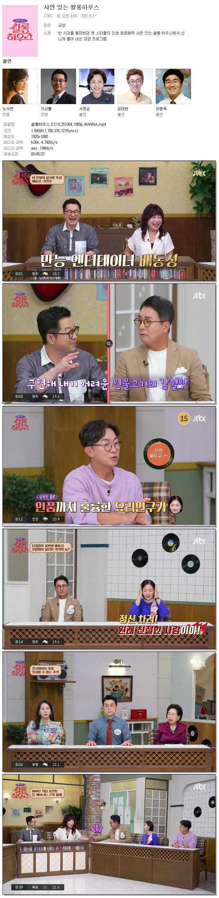 | [JTBC] 쌀롱하우스.E210.251004.1080p.WANNA[노사연, 지상렬].mp4 | 1.6 G | 00:45:22 | 1920x1080 |