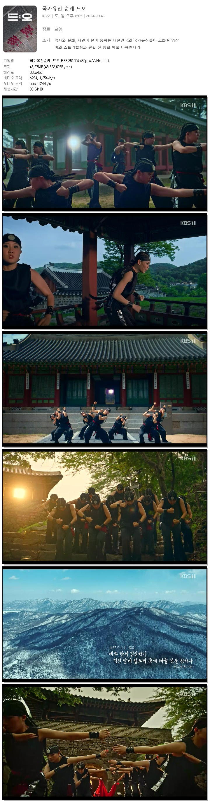 | [KBS1] 국가유산순례 드오.E38.251004.450p.WANNA.mp4 | 46.3 M | 00:04:38 | 800x450 |