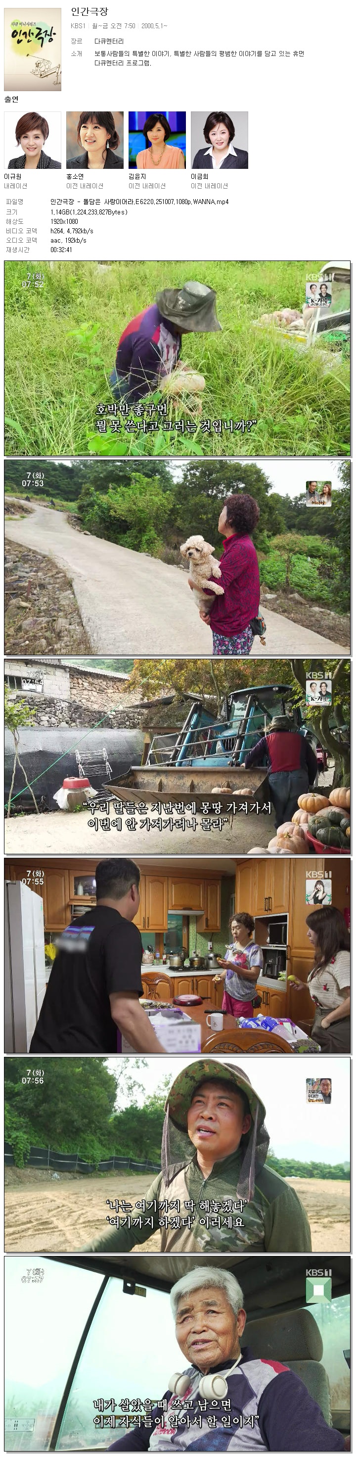 | [KBS1] 인간극장.E6220.251007.1080p.WANNA.mp4 | 1.1 G | 00:32:41 | 1920x1080 |