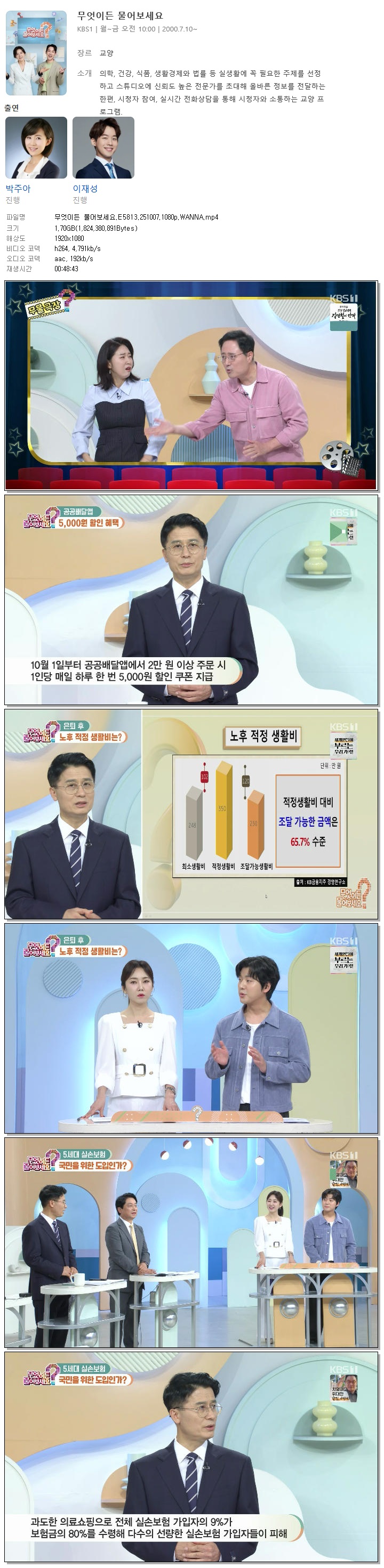 | [KBS1] 무엇이든 물어보세요.E5813.251007.1080p.WANNA[박주아, 이재성].mp4 | 1.7 G | 00:48:43 | 1920x1080 |