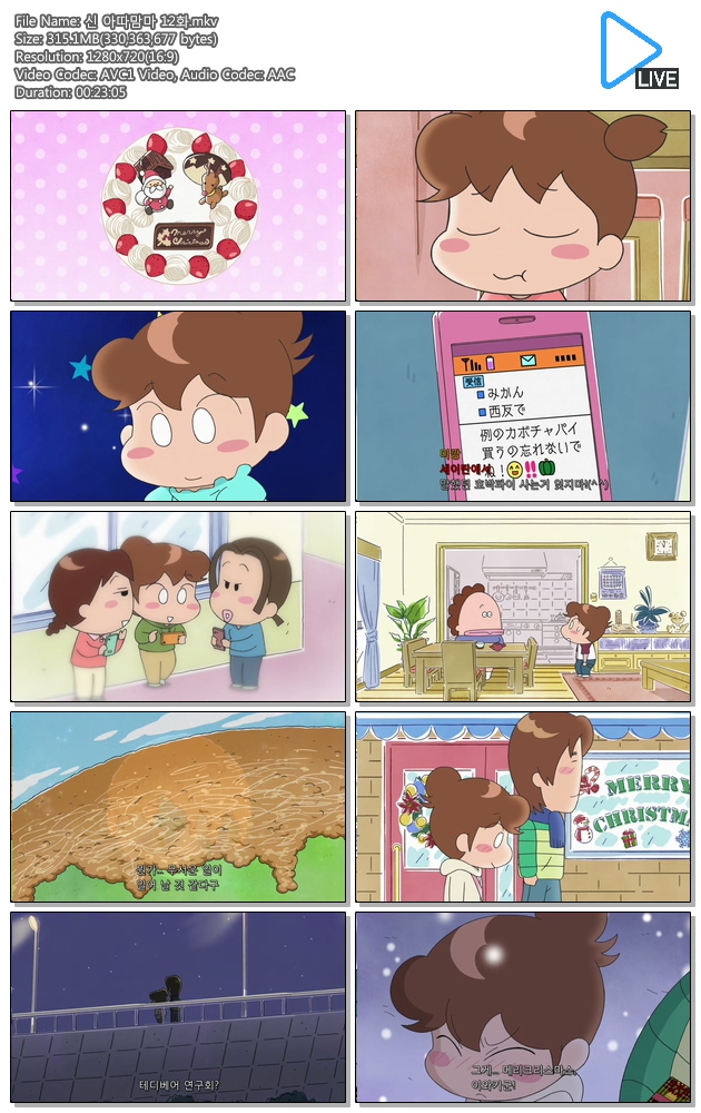 | 신 아따맘마 12화.mkv | 315.1 M | 00:23:05 | 1280x720 |
