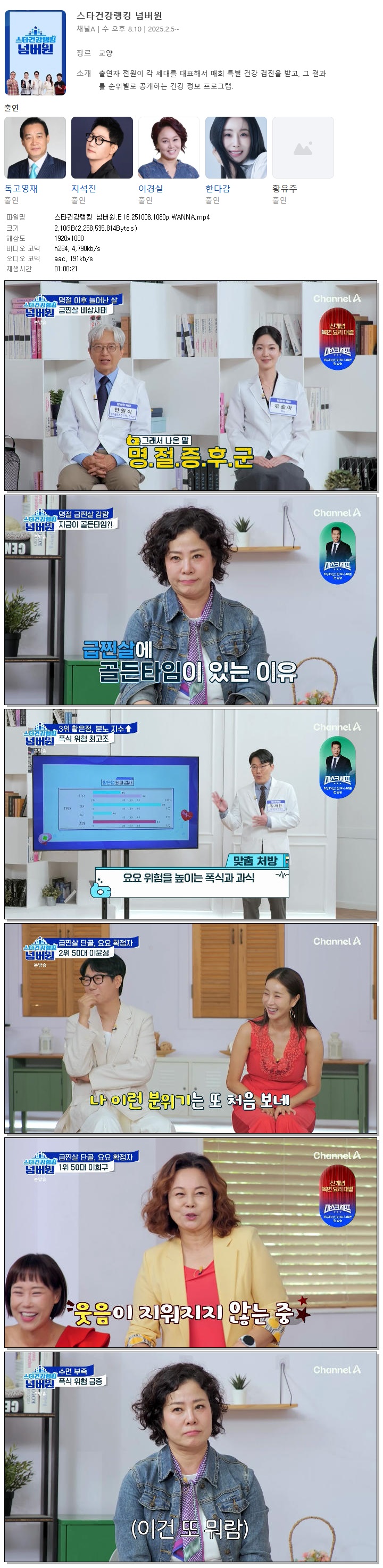 | [채널A] 스타건강랭킹 넘버원.E16.251008.1080p.WANNA[지석진, 이경실].mp4 | 2.1 G | 01:00:21 | 1920x1080 |