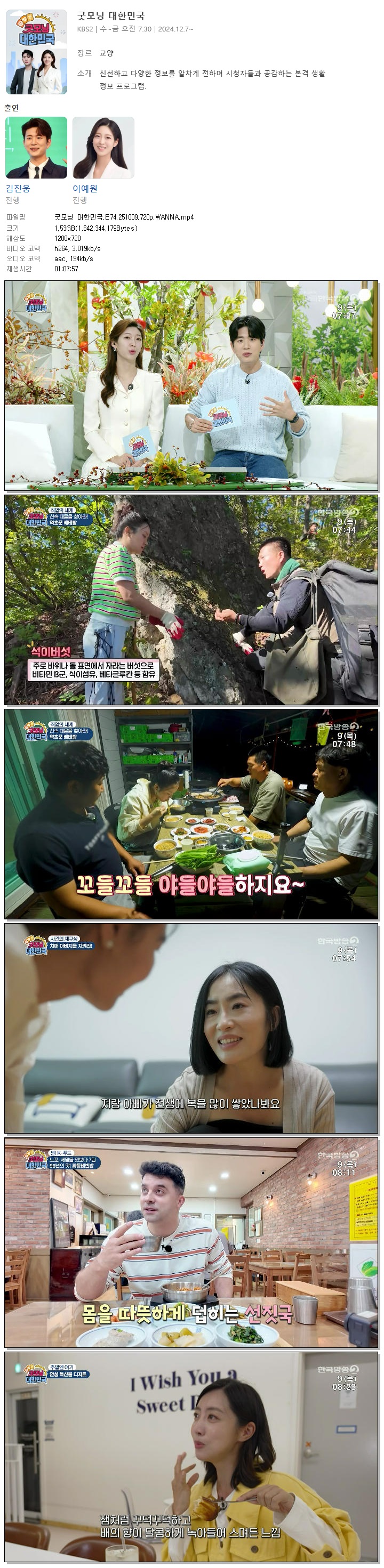 | [KBS2] 굿모닝 대한민국.E74.251009.720p.WANNA[김진웅, 이예원].mp4 | 1.5 G | 01:07:57 | 1280x720 |