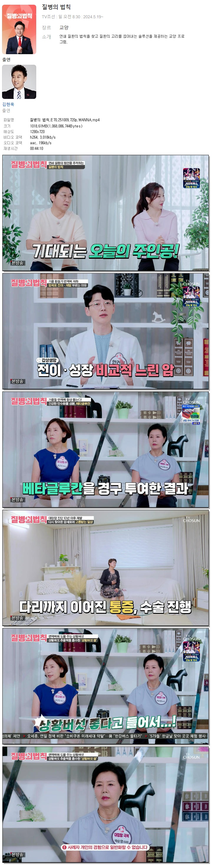 | [TV조선] 질병의 법칙.E70.251009.720p.WANNA[김현욱].mp4 | 1018.6 M | 00:44:10 | 1280x720 |