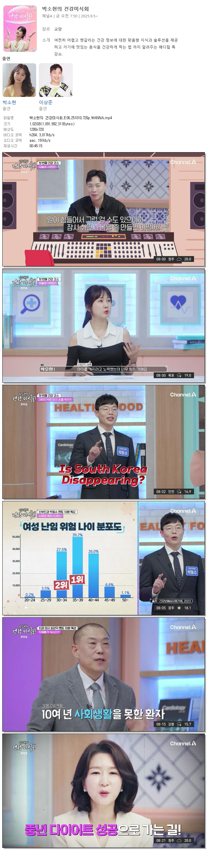 [채널A] 박소현의 건강미식회.E06.251010.720p.WANNA[박소현, 이상준].mp4 1 G 00:45:15 1280x720