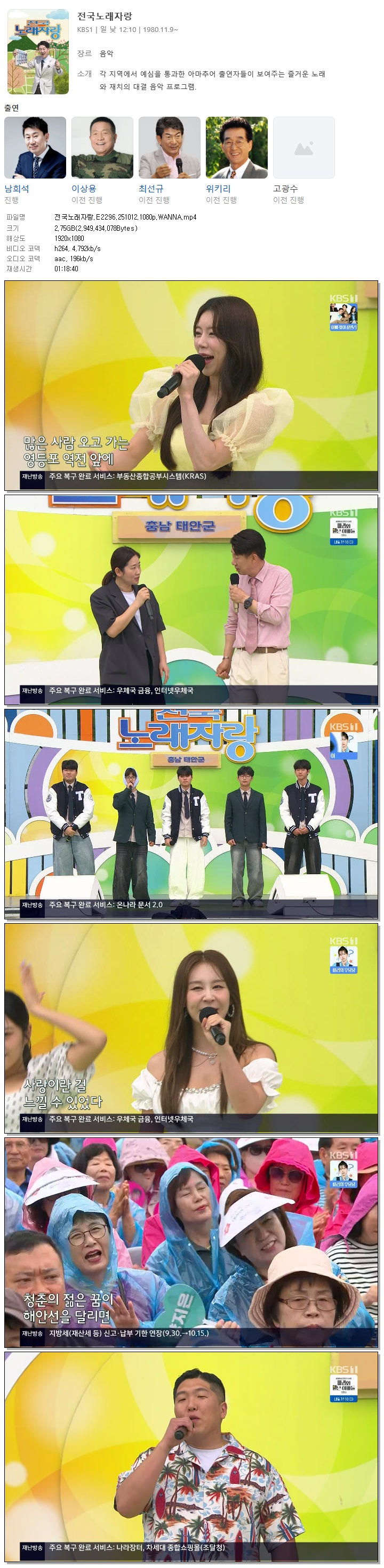 | [KBS1] 전국노래자랑.E2296.251012.1080p.WANNA[남희석].mp4 | 2.7 G | 01:18:40 | 1920x1080 |
