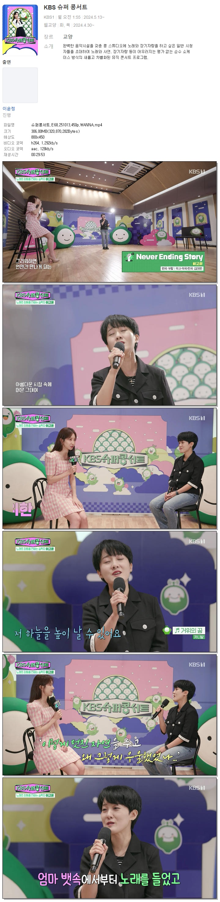 | [KBS1] 슈퍼콩서트.E68.251013.450p.WANNA[이윤정].mp4 | 306 M | 00:29:53 | 800x450 |