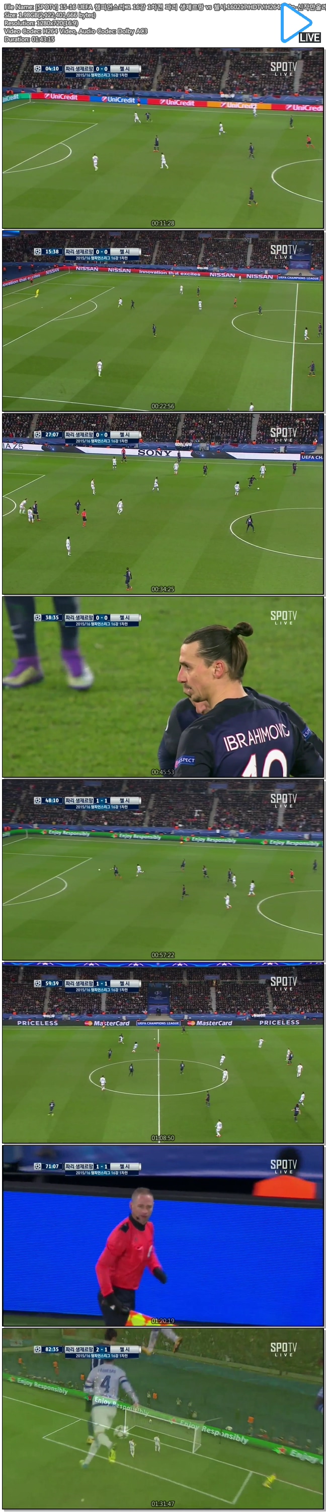 | [SPOTV] 15-16 UEFA 챔피언스리그 16강 1차전 파리 생제르망 vs 첼시.160217.HDTV.H264.720p-신작만올려.avi | 2 G | 01:43:15 | 1280x720 |