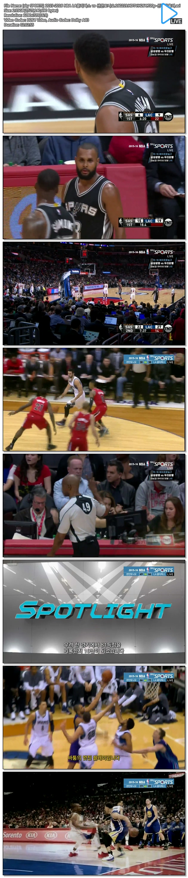 | [sky SPORTS] 2015-2016 NBA LA클리퍼스 vs 샌안토니오.160219.HDTV.H264.720p-신작만올려.avi | 2.4 G | 02:02:55 | 1280x720 |