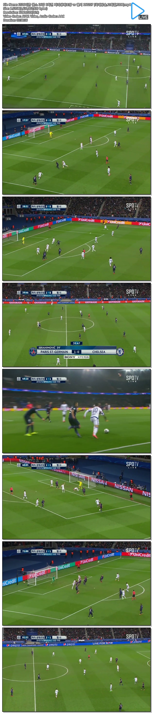 1516시즌 챔스 16강 1차전 파리생제르망 vs 첼시 160217 [국내방송,고화질,720P] 다시보기 토렌트