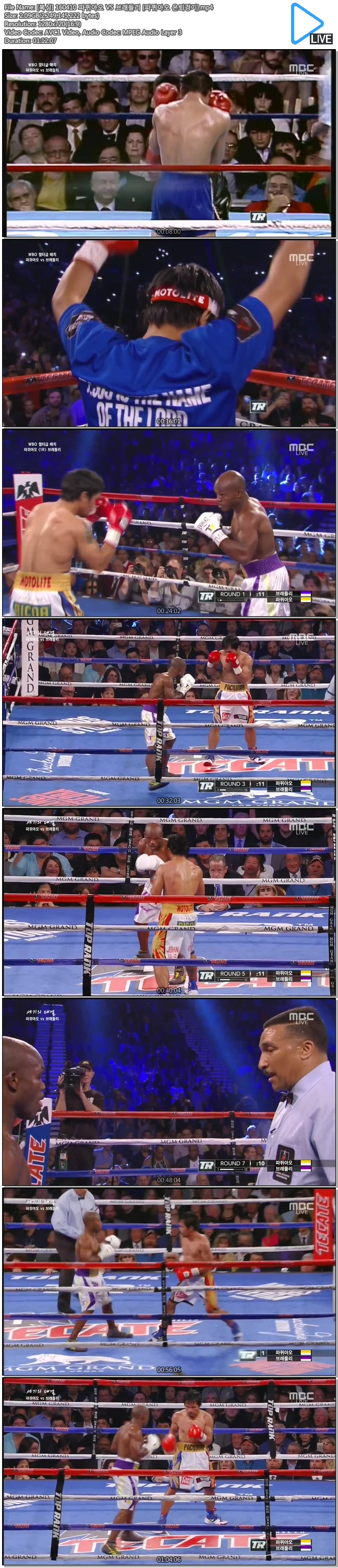 | [복싱] 160410 파퀴아오 VS 브래들리 [파퀴아오 은퇴경기].mp4 | 2.1 G | 01:12:07 | 1280x720 |