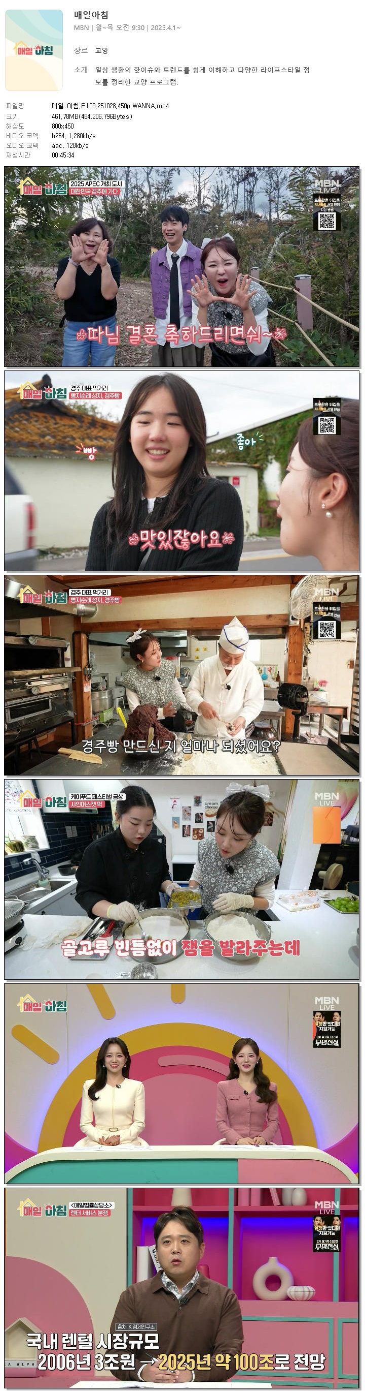 | [MBN] 매일 아침.E109.251028.450p.WANNA[한혜원, 이정수].mp4 | 461.8 M | 00:45:34 | 800x450 |