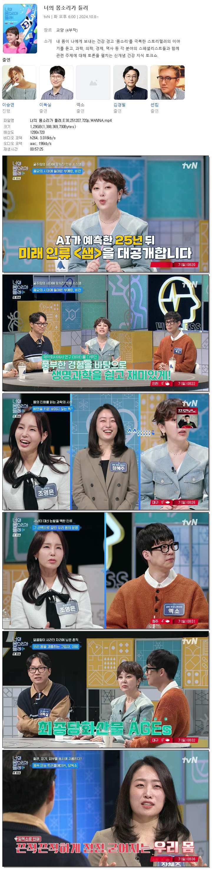 | [TVN] 너의 몸소리가 들려.E38.251207.720p.WANNA[이승연, 이독실].mp4 | 1.3 G | 00:57:25 | 1280x720 |