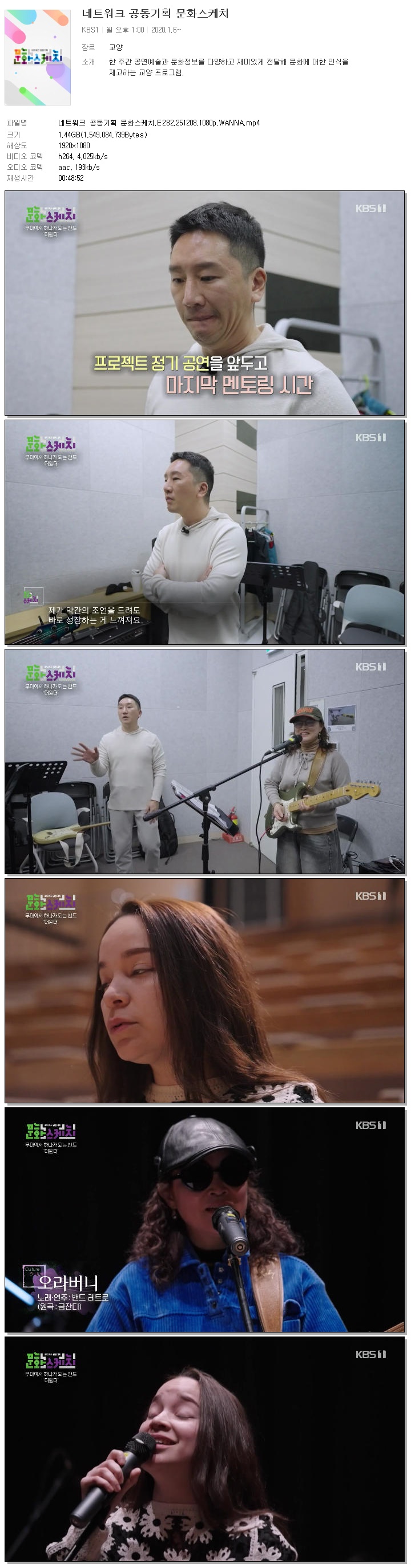 | [KBS1] 네트워크 공동기획 문화스케치.E282.251208.1080p.WANNA.mp4 | 1.4 G | 00:48:52 | 1920x1080 |