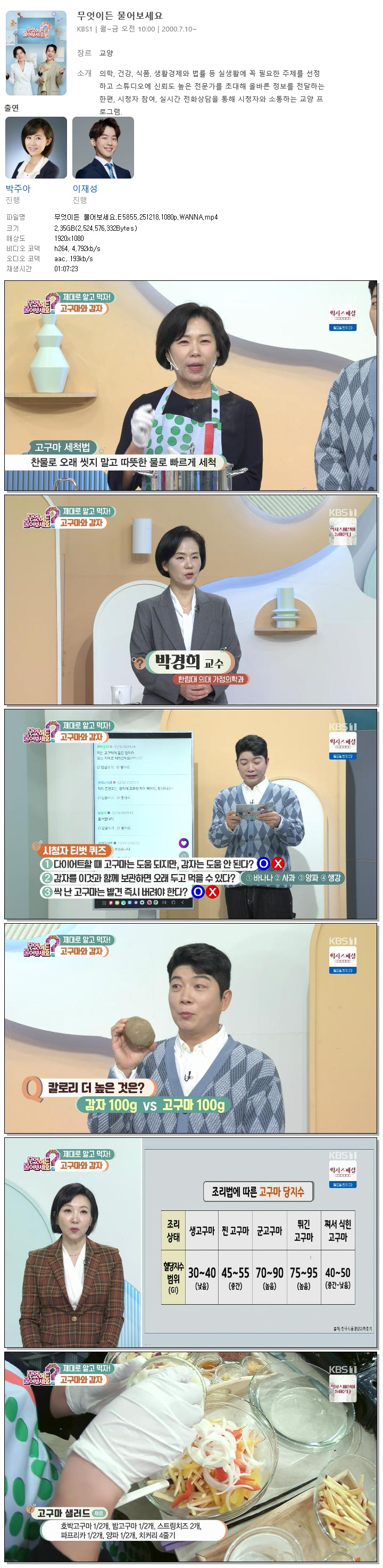 [감자와 고구마] 추운 겨울이면 따뜻한 고구마와 감자가 생각난다. 고구마와 감자는 찌고, 굽고, 볶고, 다양하게 즐기는 국민 식재료인데, 겉모습은 닮았어도 영양성분과 특징이 매우 다르다. 조리법과 보관법에 따라 맛과 영양이 완전히 달라질 수 있다. 세 명의 전문가와 함께 겨울철 영양 식품 고구마와 감자를 건강하고 맛있게 먹는 법 알아본다.