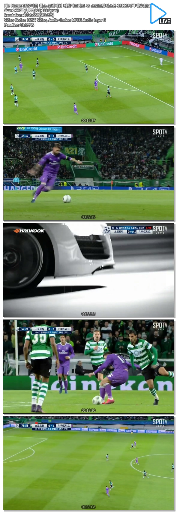 1617시즌 챔스 조별예선 레알마드리드 vs 스포르팅리스본 161123 [국내방송].avi 1.8 G 01:57:45 1004x550